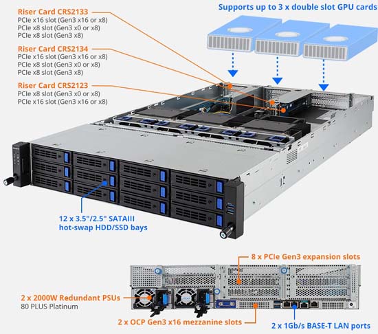 Up to 3x double slot GPU cards, Ultra-Fast M.2 with PCIe Gen3 x4 interface, 12x 3.5"/ 2.5" SATAIII hot-swappable HDD/SSD bays