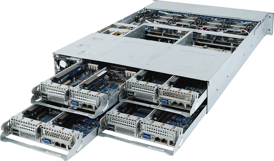 2U - 4 nodes rear access server system, 24x 2.5" NVMe hot-swappable SSD bays, 8x low profile PCIe x16 expansion slots, redundant power option