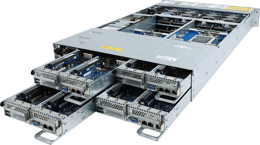 2U - 4 nodes rear access server system, 8x low profile PCIe Gen4 x16 expansion slots, 8x 1Gb/s LAN ports, redundant power option