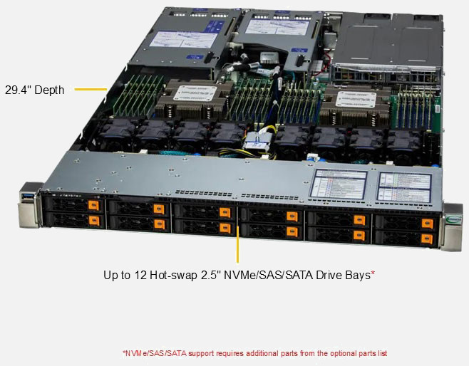 Dual AMD EPYC 9654 Processor, 2.3TB RAM, Supports up to 2x FHFL PCIe Gen5 x16 slots, 8x 2.5" SATA/NVMe Hybrid hot-swap drive bays.