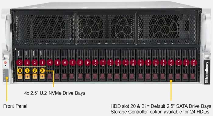 Ready for the most demanding enterprise applications, the Broadberry CyberServe EPYC EP2 424-4NVMe-G G4 can be configured with up to 24 DDR5 ECC Registered memory modules.