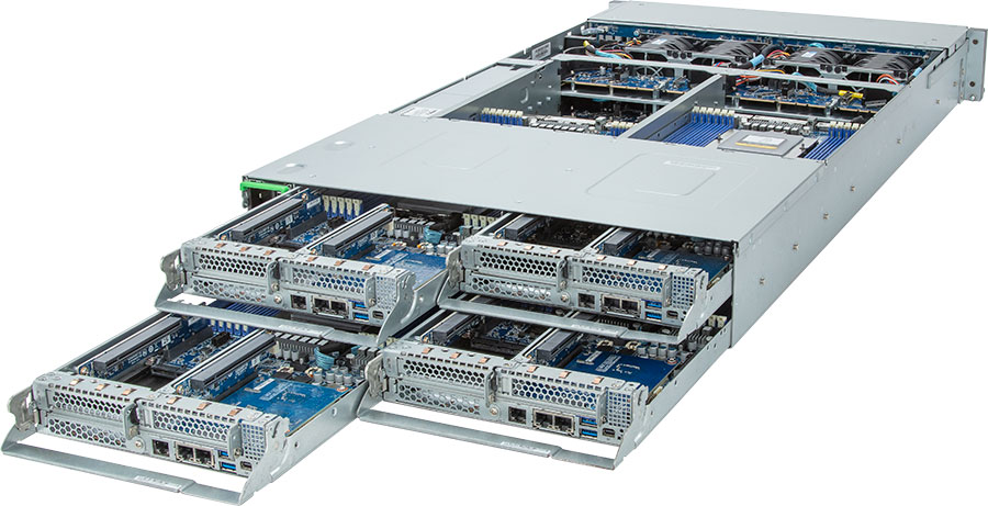 Quad Node, Dual AMD EPYC 9004 series processor(Per Node), 4x LP PCIe Gen5 x16 slots, 8x 1Gb/s LAN ports (Intel® I350-AM2), 2600W Redundant Power Supply, 8x NVMe/SATA/SAS hot-swappable bays.