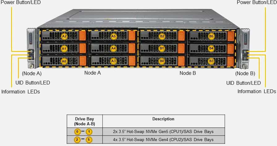 Ideal for Hyperconverged Infrastructure, Scale-Out Object Storage and Back-up & Recovery. Dual Node 2U Form Factor. Redundant 2200W Power Supply, 6x 3.5" hot-swap NVMe/SAS drive bays (Per Node)