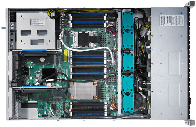 There's lots of room to expand elsewhere, since the two riser cards have three PCI Express Gen3 slots apiece. Unlike most 2U rack servers, there's room behind the two upper slots in both risers for full-height, full-length cards.