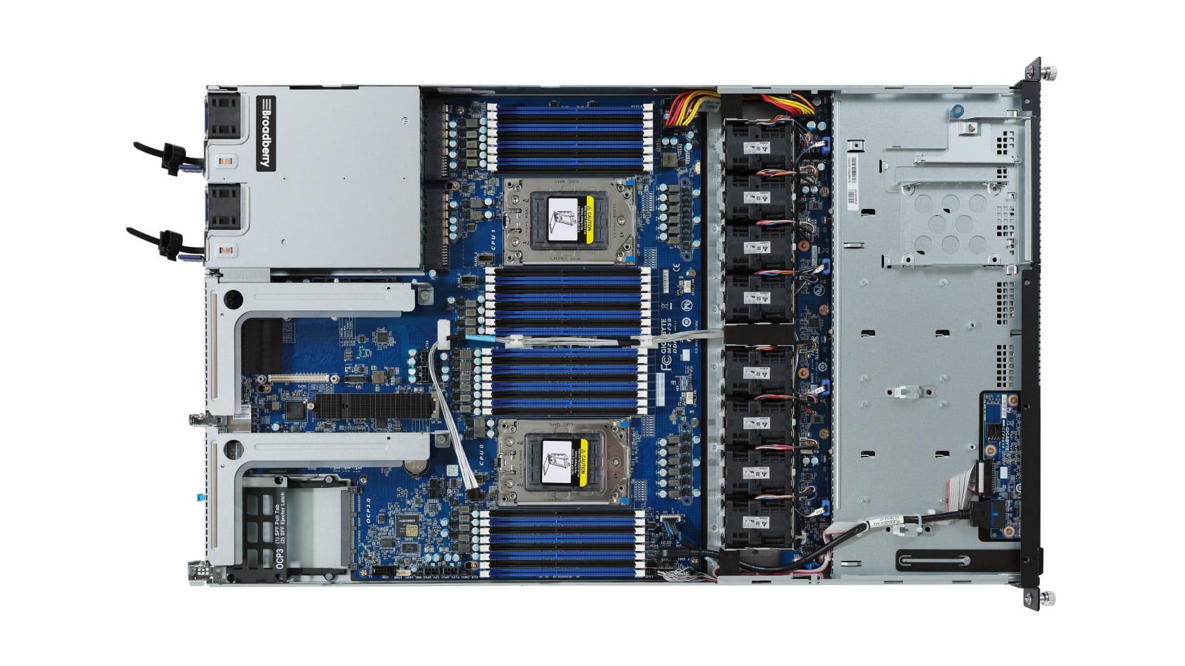 The CyberServe chassis is very well constructed and removing the lid reveals a smartly designed interior affording easy access for upgrades and maintenance. The dual EPYC sockets are located towards the front of the motherboard and flanked on each side by a total of 32 DIMM slots, allowing memory to be boosted to a massive 4TB.