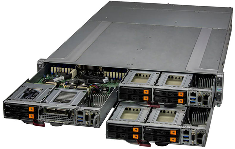 Ideal for HPC, MEC, Cloud Gaming, Multi-purpose CDN, High-availability Cache Cluster and EDA. Quad Node 2U Form Factor. Redundant 2200W Power Supply, Up to 4x 2.5" hot-swap NVMe/SATA drive bays (Per Node).