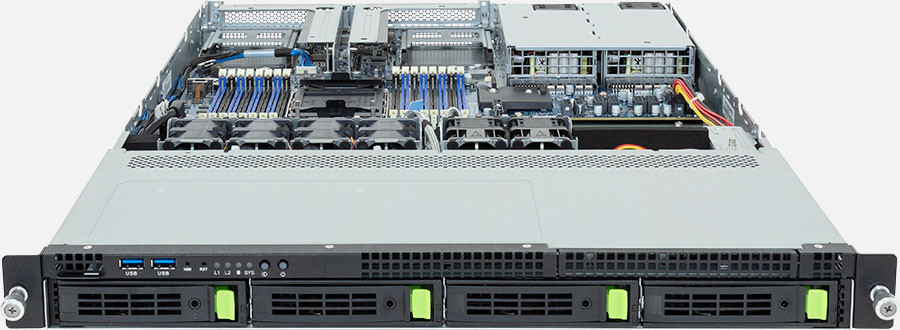 Single Intel Xeon 6 Series Processor, 2x FHHL PCIe Gen5 x16 slot, 800W Redundant power supplies, 4x 3.5"/2.5" NVMe/SATA/SAS hot swap drive bays.