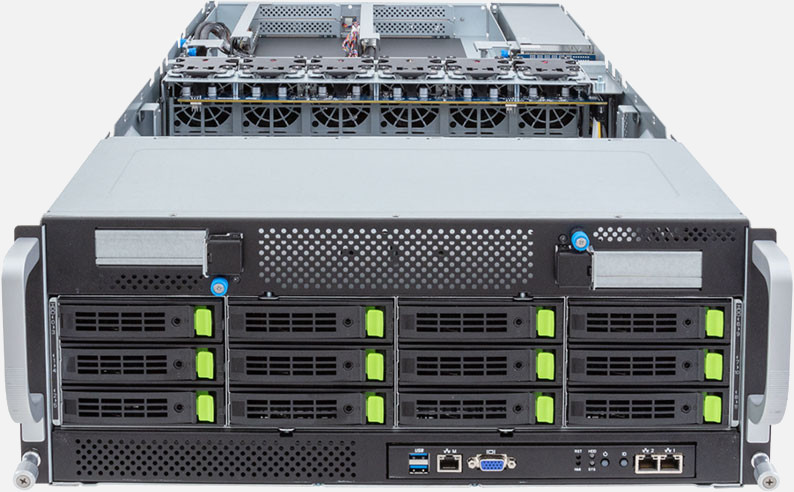 Dual 4th Gen Intel Xeon Scalable Processors, Supports up to 10x double slot GPU cards and 2x PCIe Gen5 x16 (LP) Slots, 2x 10Gb/s BASE-T LAN ports (Intel® X710-AT2), 12x 3.5"/2.5" SATA/SAS/NVMe hot-swappable drive bays.