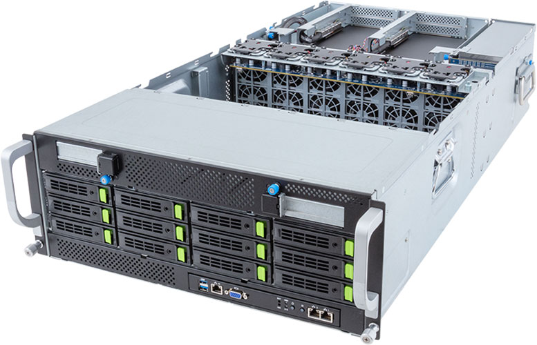 Dual 4th Gen Intel Xeon Scalable Processors, Supports up to 8x double slot GPU cards and 4x PCIe Gen5 x16 (FHFL) Slots, 2x 10Gb/s BASE-T LAN ports (Intel® X710-AT2), 12x 3.5"/2.5" SATA/SAS/NVMe hot-swappable drive bays.