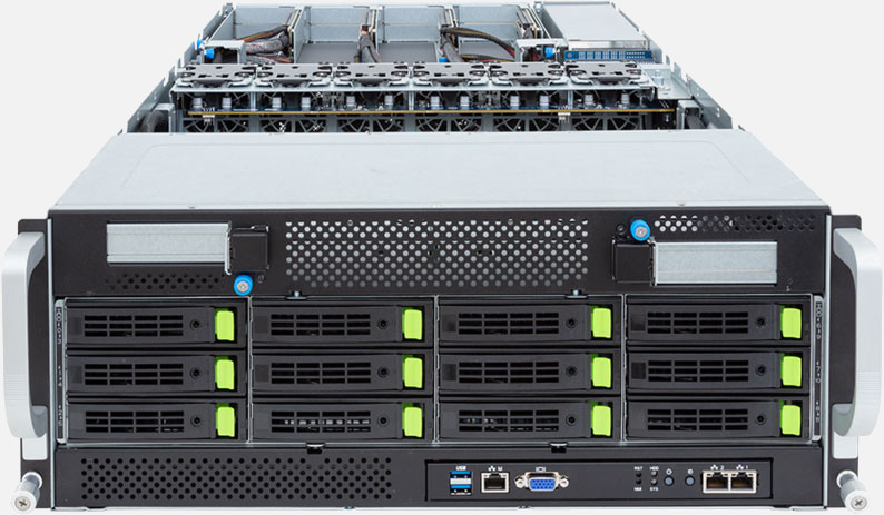 Dual 4th Gen Intel Xeon Scalable Processors, Supports up to 8x double slot GPU cards and 10x PCIe Gen5 x16 (LP) Slots, 2x 10Gb/s BASE-T LAN ports (Intel® X710-AT2), 12x 3.5"/2.5" SATA/SAS/NVMe hot-swappable drive bays.