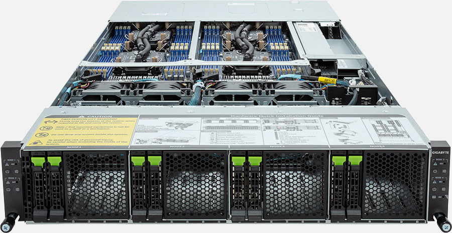 Water Cooling, Quad Node, Dual 4th Gen Intel Xeon Scalable Processors (Per Node), 4x LP PCIe Gen5 x16 slots, 2600W Redundant Power Suppply, 8x 2.5" NVMe/SATA/SAS hot-swappable drive bays.