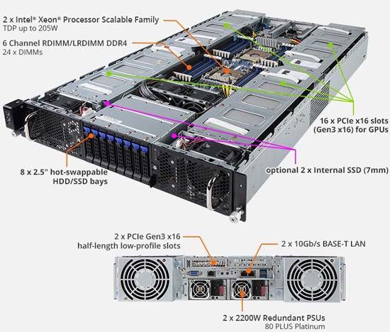 NVIDIA validated GPU platform, 2x 10Gb/s BASE-T LAN ports, 8x 2.5" hot-swappable HDD/SSD bays, redundant power option