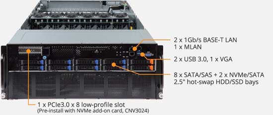 Up to 8x NVIDIA Tesla® V100 PCIe GPGPU cards, 2x 10Gb/s BASE-T LAN ports (Intel® X550-AT2), 2x GbE LAN ports (Intel® I350-AM2), redundant power option.