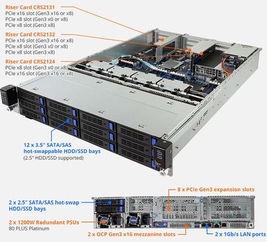 12x 3.5" and 2x 2.5" SATAIII hot-swap HDD/SSD bays, 8x PCIe Gen3 expansion slots, redundant power option.