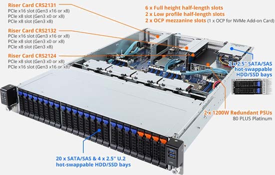 Redundant power option, 8x PCIe Gen3 expansion slots, 4x 2.5" U.2, 22x SATA/SAS hot-swap HDD/SSD bays