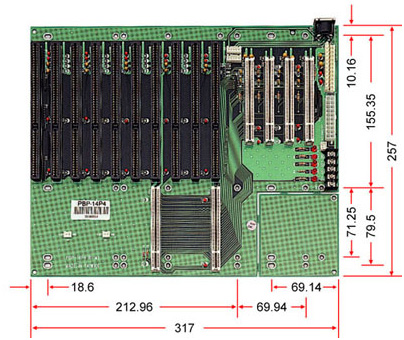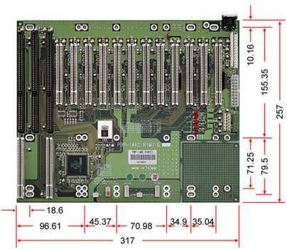 Fit for 14-slot chassis ATX power connector support 9 ISA / 4 PCI usable Back Plane. 317(L) x 257(W) mm;12.48"(L) x 10.12"(W).