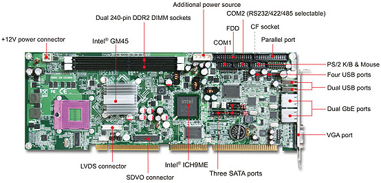 Intel latest 45 nm Core 2 Duo or Celeron M processor based PICMG Single Board Computer with DDR2 SDRAM, VGA, Dual Gigabit Ethernet, and Audio