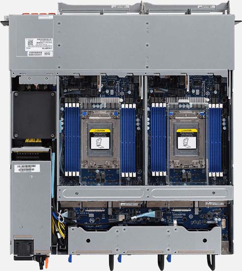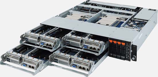The Gigabyte H242-Z11 is a 2U, 4 node system powered by AMD EPYC 7002 series processors. It is configurable with up to 4TB of RAM and 4x 2.5 NVMe hot-swap drives. It also features 8x PCIe x16 expansion slots and 1200W 80 PLUS Platinum redundant PSU. For networking this system has 8 x 1Gb/s LAN ports (Intel I350-AM2).