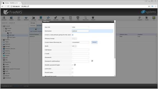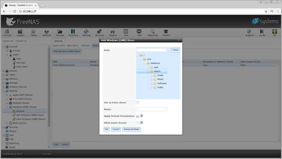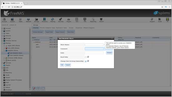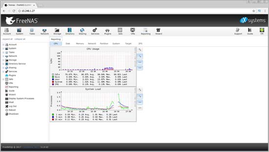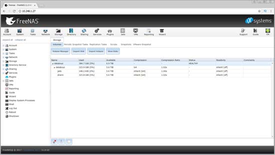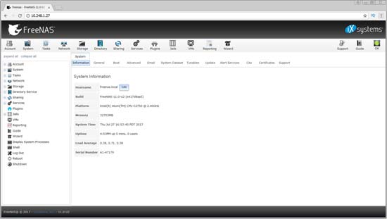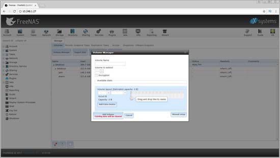 If FreeNAS has one goal, it's simplifying complex administrative tasks for as wide a user base as possible. Every aspect of a FreeNAS system can be managed from a Web User Interface. A setup Wizard further simplifies configuration at installation time or later in the setup process. Volume creation, or the setting of permissions on individual shares or performing software updates, can be done without missing a critical step or encountering a silent failure.