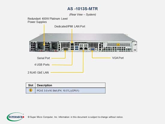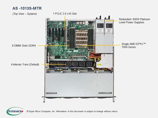 The Supermicro A+ Server 1013S-MTR | AS -1013S-MTR supports the AMD AMD EPYC "NAPLES" Gen 1, AMD EPYC "ROME" Gen 2 family in a high-density 1U form-factor. These SuperServers are ideal for network infrastructure, front-end enterprise, and minimal-downtime cluster server systems.