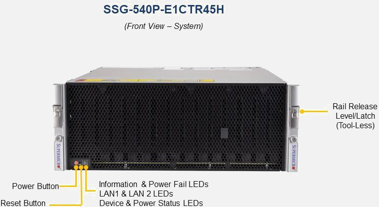 The Supermicro UP Storage SuperServer SSG-540P-E1CTR45H | SSG-540P-E1CTR45H features hot-swap hard drives, giving you more flexibility and allowing you to remove drives without having to shut down the system.