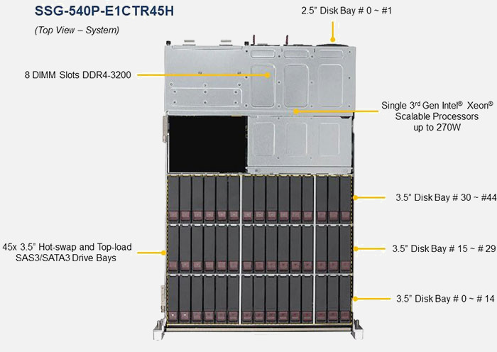 Optimised for database applications, backup storage, cold storage. Redundant power supply. 45x Top-loading hot-swap drive bays.