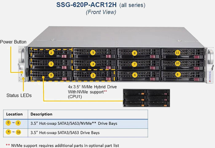 The Supermicro Storage SuperServer SSG-620P-ACR12H | SSG-620P-ACR12H features hot-swap hard drives, giving you more flexibility and allowing you to remove drives without having to shut down the system.