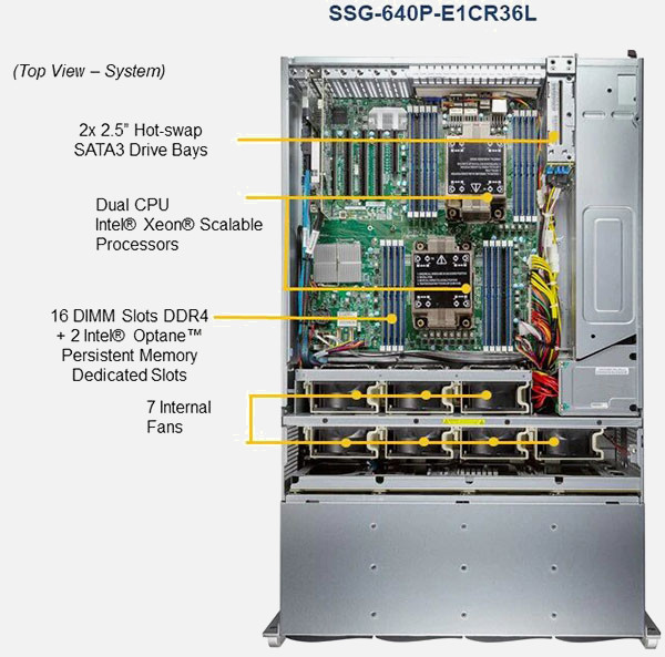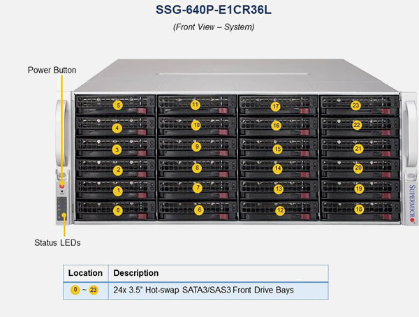 The Supermicro Storage SuperServer SSG-640P-E1CR36L | SSG-640P-E1CR36L can be configured with 2.5" drives, a more space efficient and low noise option. These drives also offer energy savings and increased flexibility.