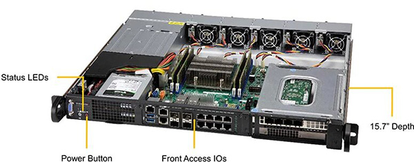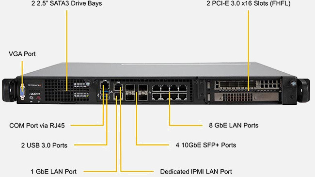 Optimised for Multi-Access Edge Computing and AI Artificial Intelligence. 2 PCI-E 3.0 x16 (FHFL) slots. 9 GbE (1 port for management), 4x 10G SFP+, and 1 Dedicated IPMI LAN.