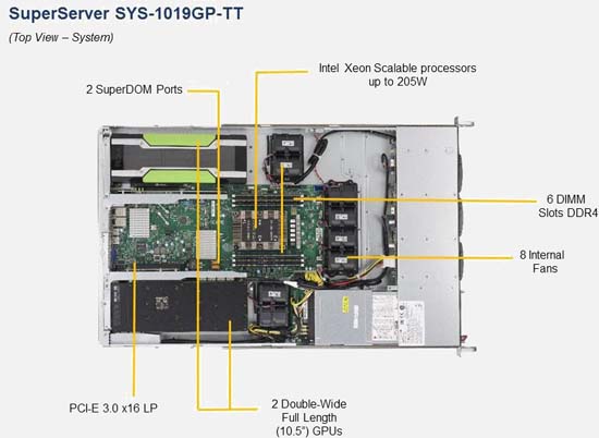 The Supermicro SuperServer 1019GP-TT | SYS-1019GP-TT supports the Intel Xeon Scalable Processors 2nd Generation family in a high-density 1U form-factor. These SuperServers are ideal for network infrastructure, front-end enterprise, and minimal-downtime cluster server systems.