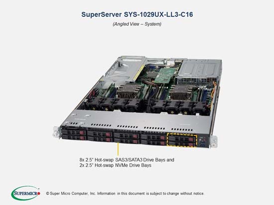 The Supermicro SuperServer 1029UX-LL3-C16 | SYS-1029UX-LL3-C16 can be configured with 2.5" drives, a more space efficient and low noise option. These drives also offer energy savings and increased flexibility.