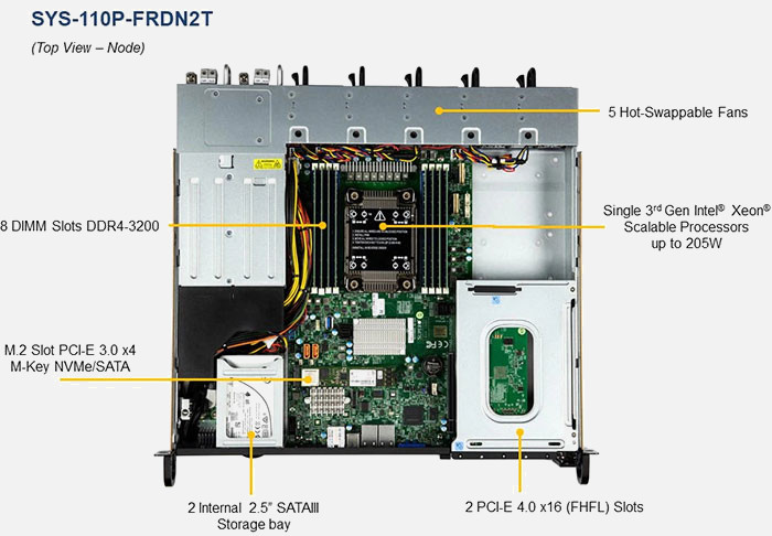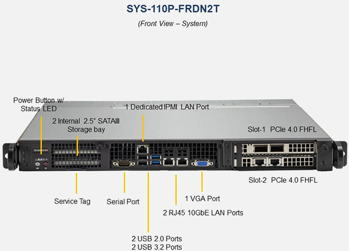 The Supermicro IoT SuperServer SYS-110P-FRDN2T | SYS-110P-FRDN2T can be configured with 2.5" drives, a more space efficient and low noise option. These drives also offer energy savings and increased flexibility.