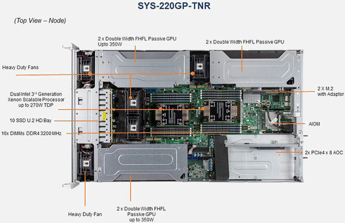 A 2U Supermicro SuperServer based on 2x Intel 3rd Gen Intel Xeon Scalable Processor (X12) range of processors, the Supermicro GPU SuperServer SYS-220GP-TNR | SYS-220GP-TNR is configurable with up to 10x Hot-Swap Drives drive bays, and designed for optimal performance with 16x 3200Mhz DDR4 memory sockets .