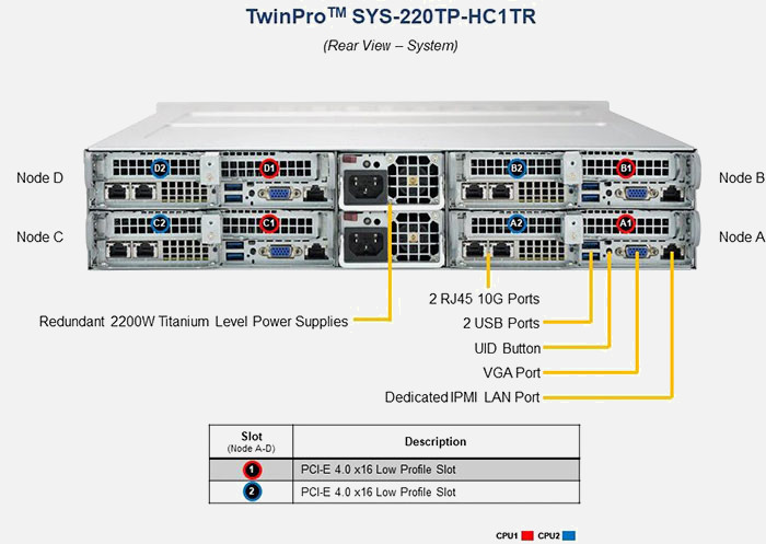 4 node system ideal for big data/big science, hyperconverged infrastructure and HPC. 2x PCI-E 4.0 x16 slots, 1x PCI-E 4.0 x8 slot and 16 DIMMs of memory per node.