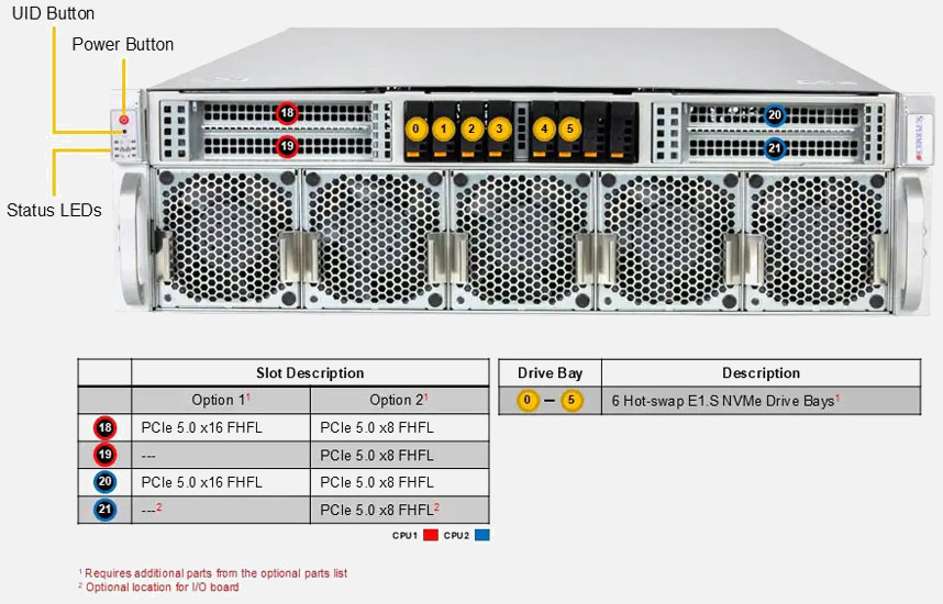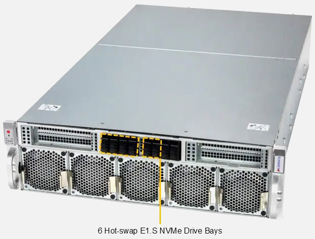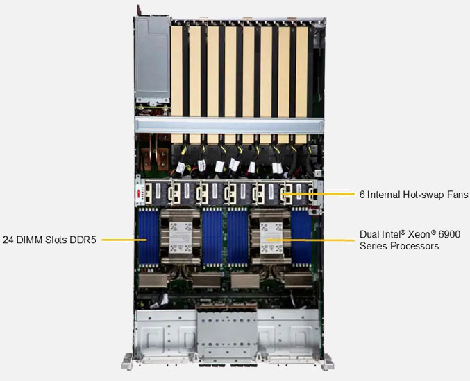 Dual Intel Xeon 6 6900 series Processor. Ideal for AI/Deep Learning Training & High Performance Computing. 8x PCI-E 5.0 x16 FHHL slot, 1x PCI-E 5.0 x16 FHFL Slot. 3200W Redundant Power Supply, 6x E1.S NVMe Hot swap drive bays.