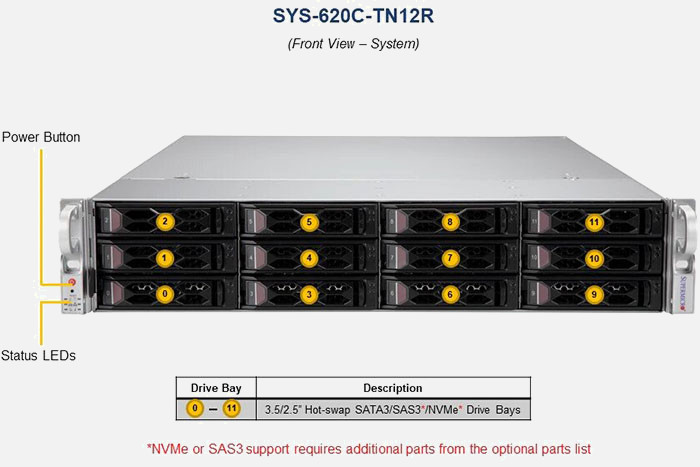 The Supermicro CloudDC SuperServer SYS-620C-TN12R | SYS-620C-TN12R features hot-swap hard drives, giving you more flexibility and allowing you to remove drives without having to shut down the system.