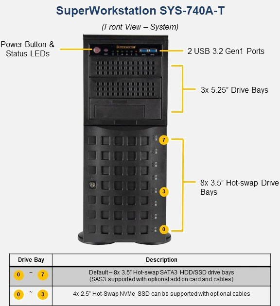 Configure the Supermicro Super Workstation SYS-740A-T | SYS-740A-T with 3.5" drives. These drives are more cost-effective, offer a larger storage capacity and offer more flexibility.