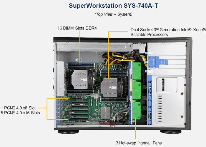 A 4U Supermicro SuperServer based on 2x Intel 3rd Gen Intel Xeon Scalable Processor (X12) range of processors, the Supermicro Super Workstation SYS-740A-T | SYS-740A-T is configurable with up to 8x Hot-Swap Drives drive bays, and designed for optimal performance with 16x 3200Mhz DDR4 memory sockets .
