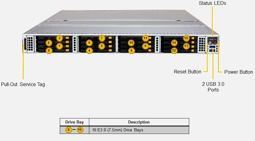 Single AMD EPYC 9004 Series Processor. 2x PCIe 5.0 x16 FH slot, Redundant 1600W power supply. 16x E3.S NVMe hot-swappable drive bays.