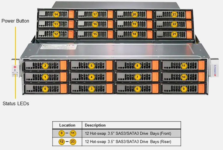 The Supermicro Storage SuperServer 521E-E1CR24H | SSG-521E-E1CR24H features hot-swap hard drives, giving you more flexibility and allowing you to remove drives without having to shut down the system.