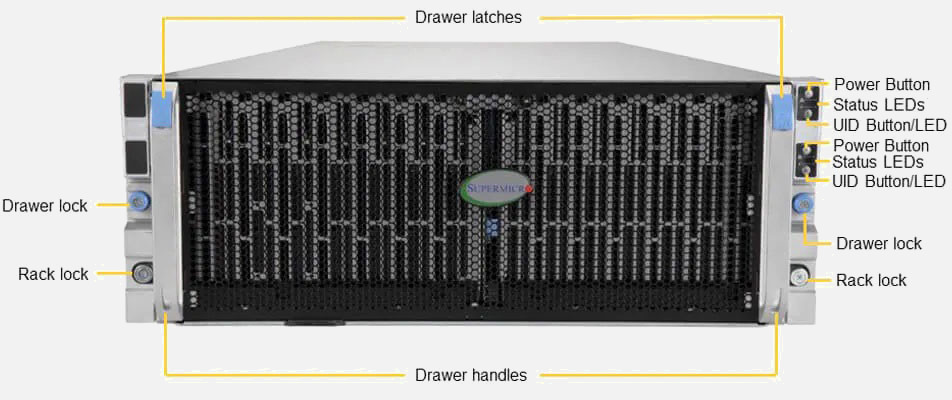 The Supermicro Storage SuperServer 640SP-DE1CR60 | SSG-640SP-DE1CR60 features hot-swap hard drives, giving you more flexibility and allowing you to remove drives without having to shut down the system.