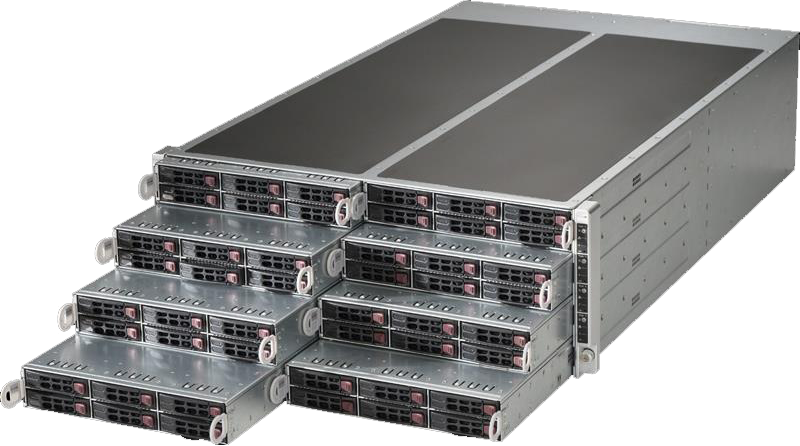 Ideal for HPC and Big Data, Hyperscale, Hyperconverged and Data Centre Enterprise Applications. Eight Node 4U Form Factor. Redundant 2000W Power Supply, 6x 2.5" hot-swap NVMe/SATA drive bays (Per Node)