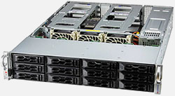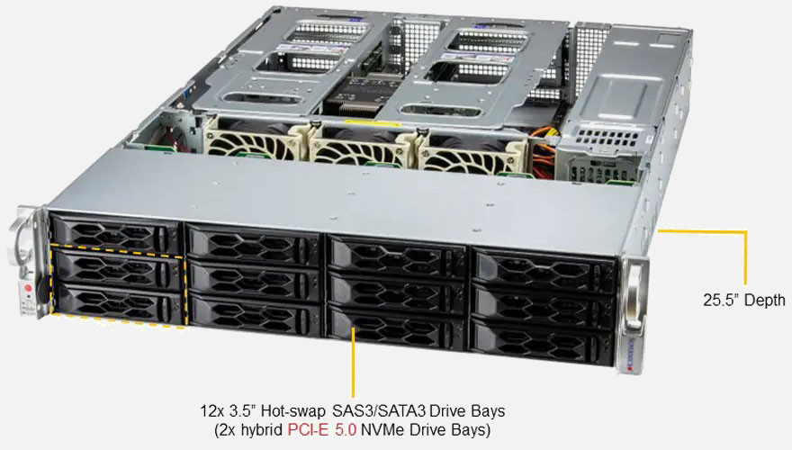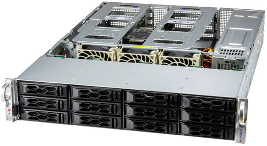 Ideal for virtualisation, cloud computing, enterprise server. 2x PCI-E 5.0 x16 slots, 4x PCI-E 5.0 x8 slots. Redundant 1200W/1000W Titanium Power Supply, 12x 3.5" SATA / 2x 3.5" NVMe hybrid drives