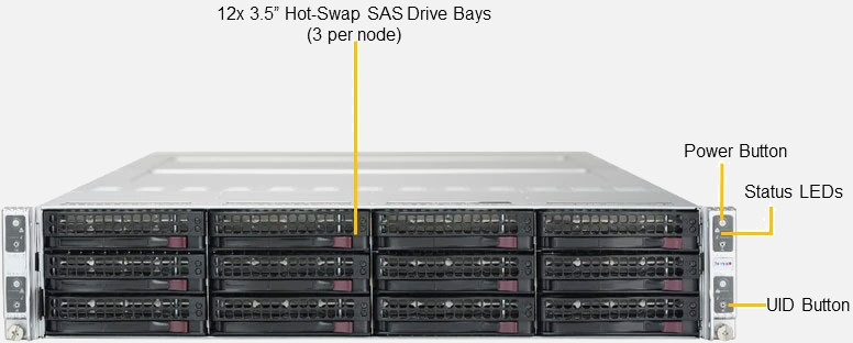 The added benefit of hot-swap hard drives means that the CyberServe Xeon EP2-6029TP 4 Node 2U Server can have any of its 12 hot-swap hard drives removed during maintenance whilst the system is running completely un-interrupted. The added benefit of hot-swap hard drives means that the CyberServe Xeon EP2-6029TP 4 Node 2U Server can have any of its 12 hot-swap hard drives removed during maintenance whilst the system is running completely un-interrupted.Storage Technology